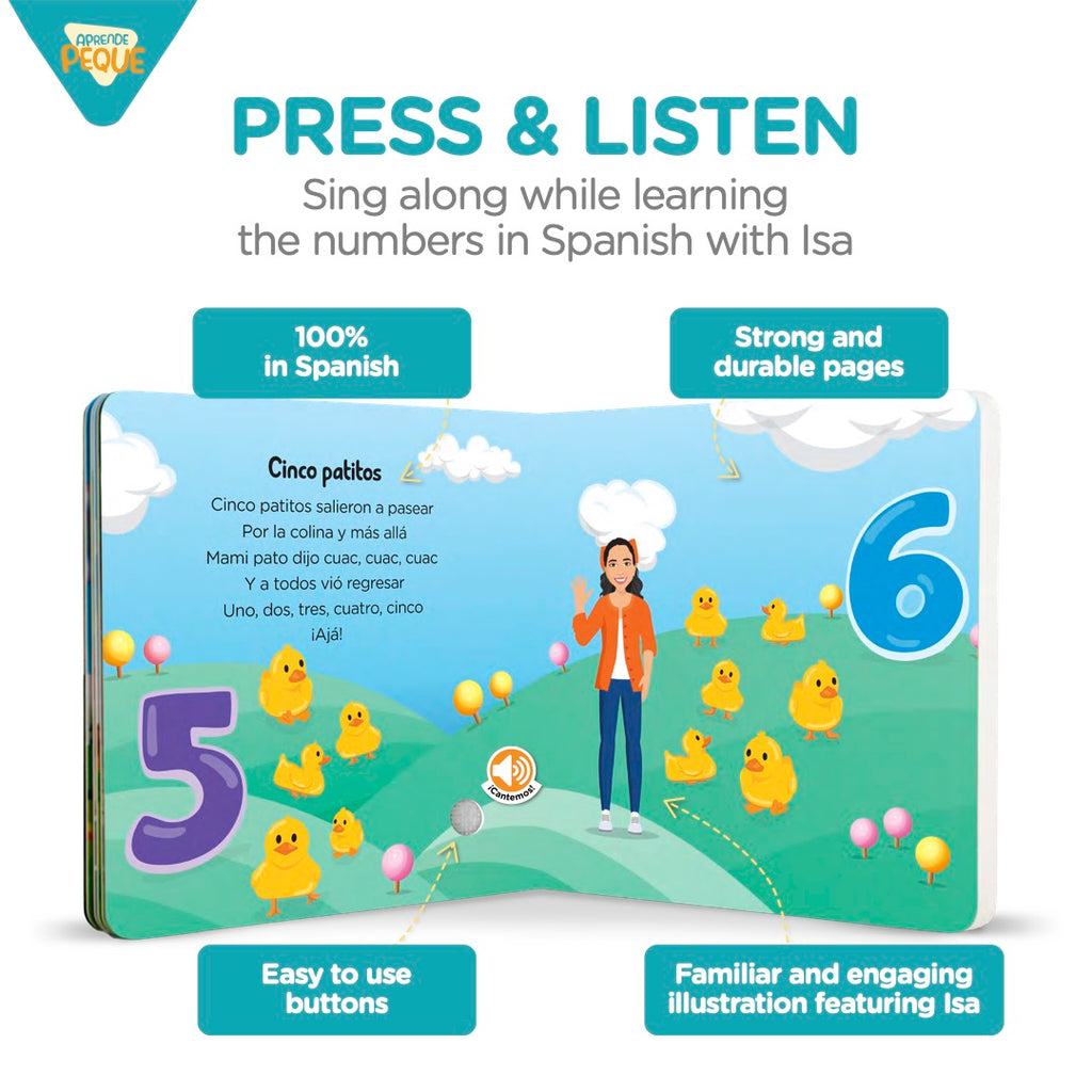 Learn to count through music with Isa in Aprende Los Números! This Aprende Peque sound book turns learning into a fun and musical experience. Isa guides children through songs to recognize and practice numbers from 1 to 10. Those who love Isa will recognize familiar characters and gestures from their favorite videos. Known for creating 100% Spanish content that blends original songs and fresh takes on timeless classics, Aprende Peque celebrates Latin culture and makes learning fun. This soundbook perfectly reflects the creativity and charm you love from our channel!