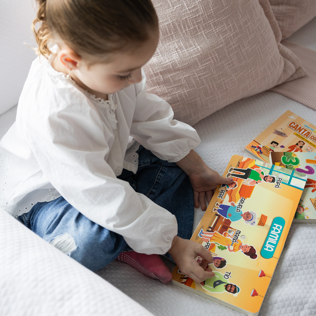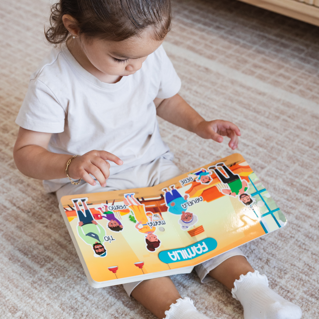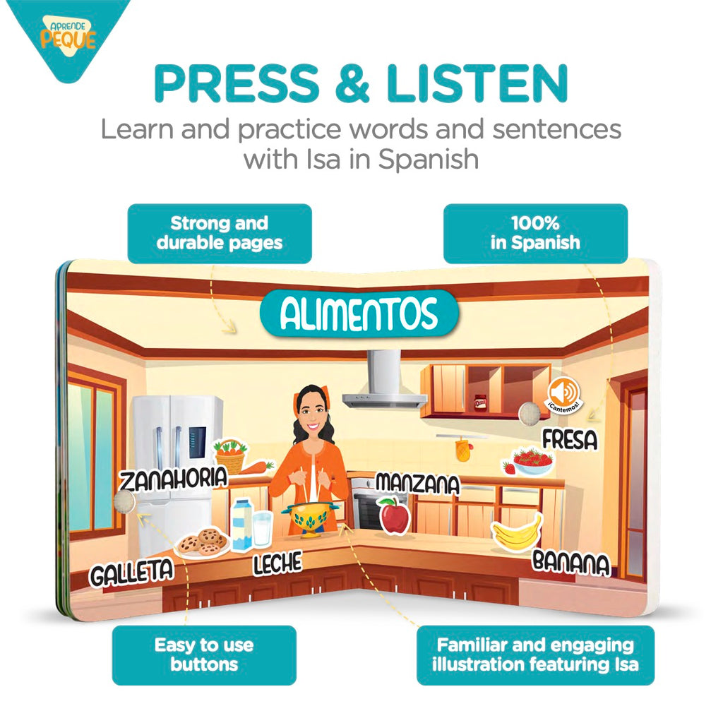 Learn and practice words and sentences with Isa in Mis Primeras Palabras, Aprende Peque’s interactive sound book that makes discovering new language exciting and engaging. Isa guides children through colorful pages and playful sounds to recognize and practice their very first words. Those who love Isa will recognize familiar characters and gestures from their favorite videos. Known for creating 100% Spanish content that blends original songs and fresh takes on timeless classics, Aprende Peque celebrates Latin culture and makes learning fun. This soundbook perfectly reflects the creativity and charm you love from our channel!